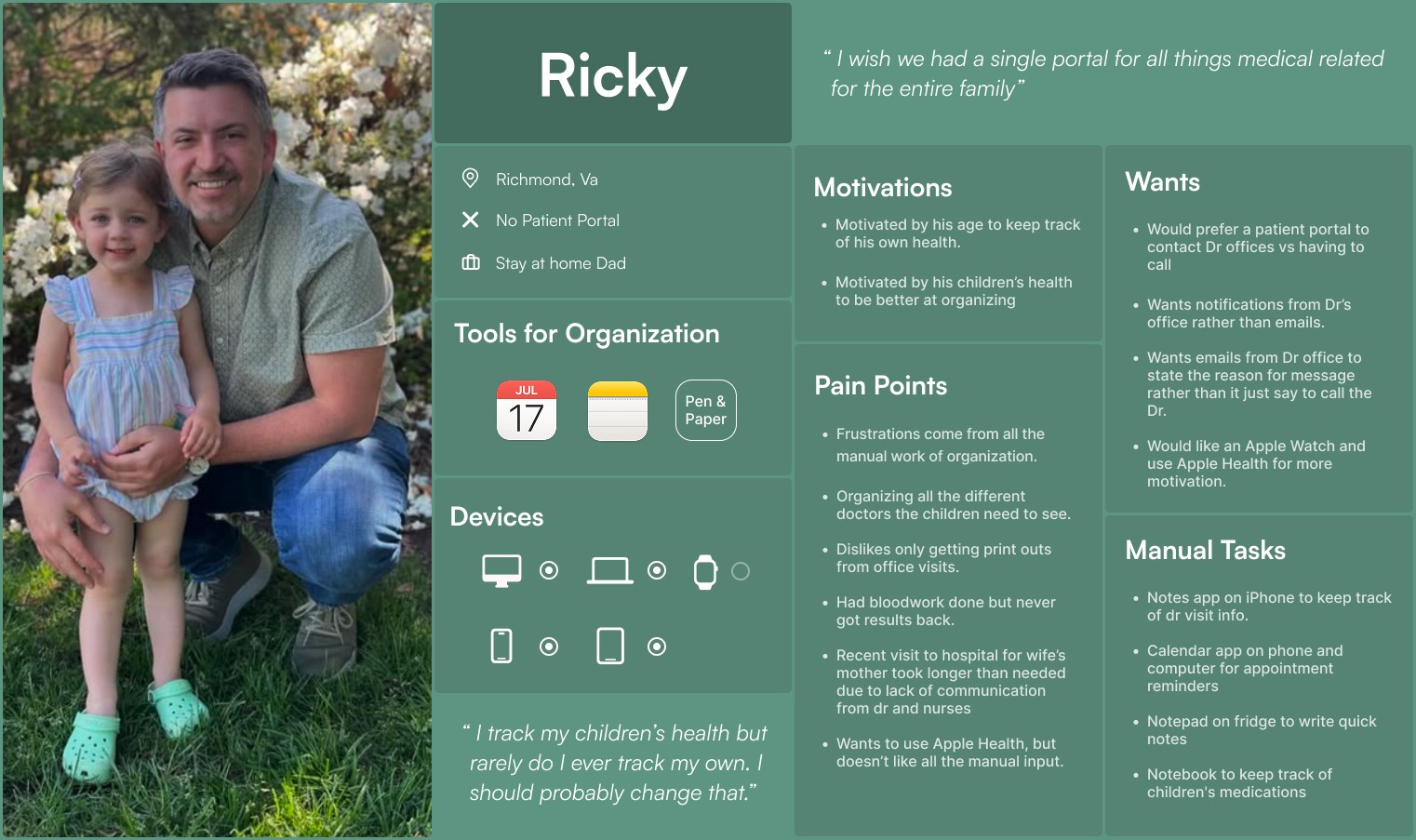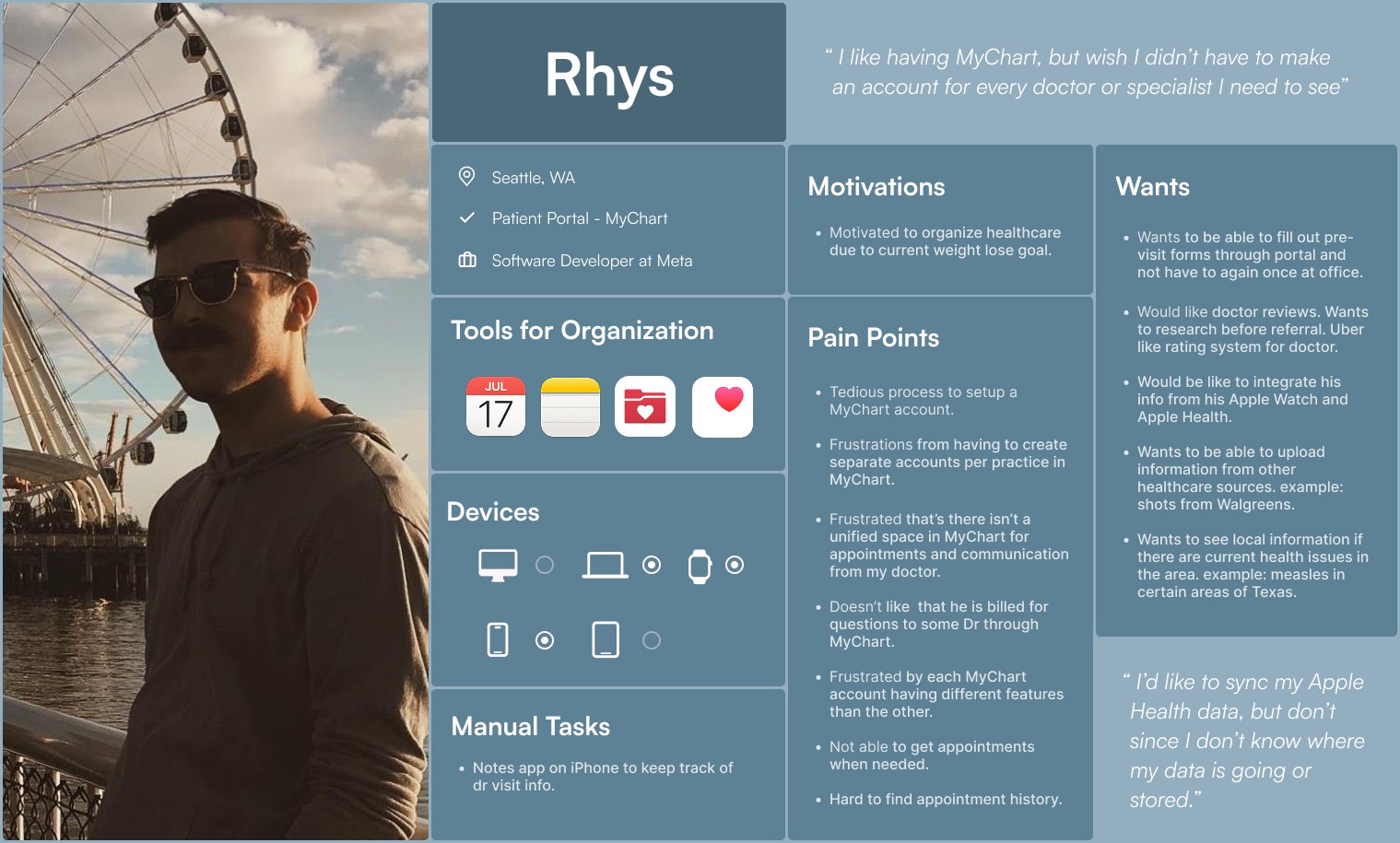 I gained a lot of insight from the interviews that allowed me to assemble details into user personas. These became the target audience base for users with and without a patient portal.