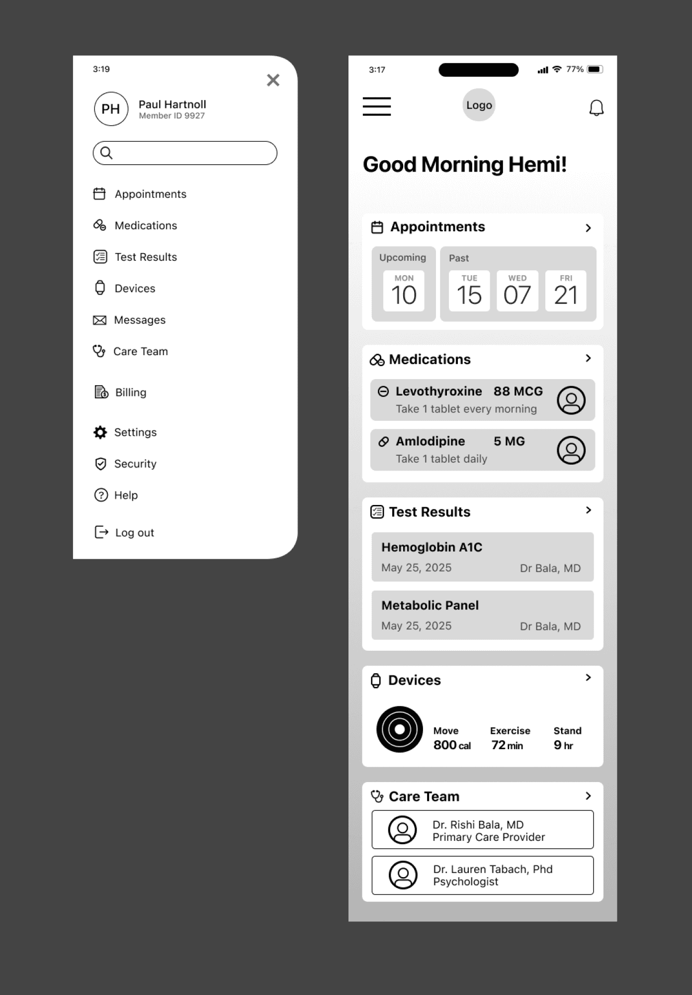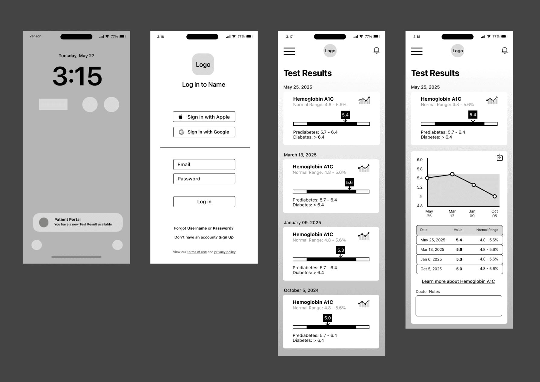 I spent one month as the sole designer completing all the steps of this project. I conducted the research, synthesized the findings, and designed and built a mobile-first patient portal. Once finished, I conducted user tests of the product, and then finalized it for use.