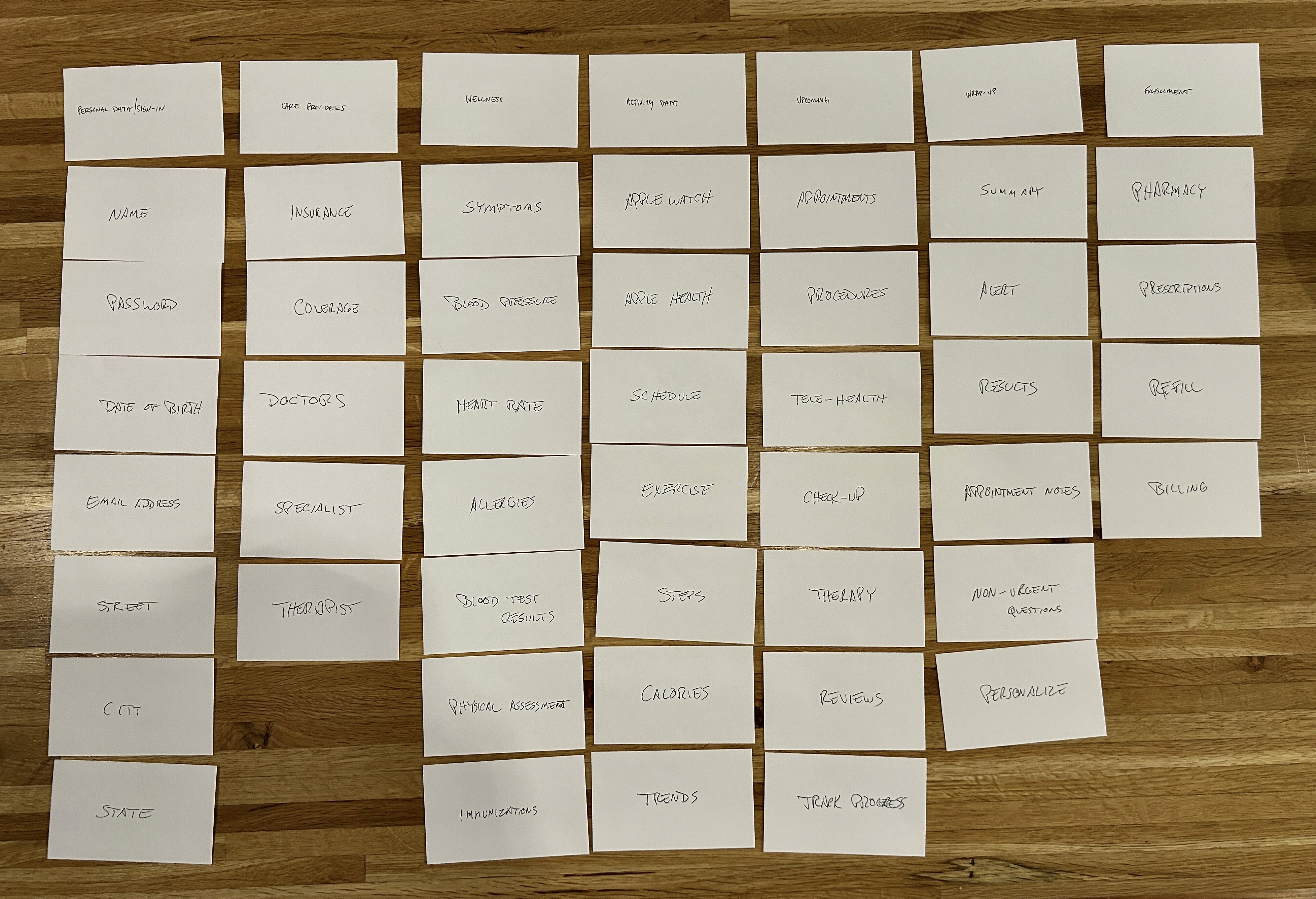 After storyboarding and gathering ideas for features, what items became important for the users? I enlisted their help to do card sorts to find out. Each card had a topic related to a patient portal which they would use to build a structure for the site. What order made sense to them when navigating? This solidified the structural idea I had for the site - a dashboard.