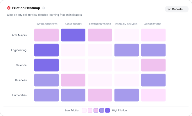 - Cohort heatmaps reveal where entire groups struggle with specific content