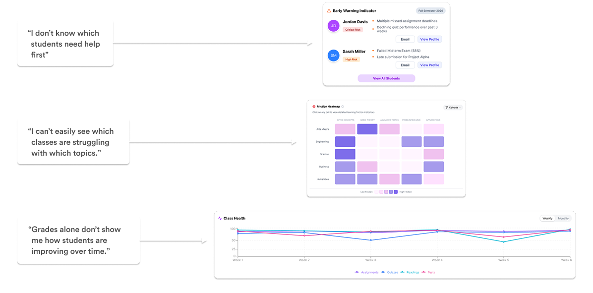 Educators often juggle lesson planning, grading, and student performance across disconnected tools. In that fragmentation, one thing gets lost: timely visibility into who is struggling.This project explores how an attention-based dashboard helps educators recognize patterns earlier and intervene with greater clarity.Early exploration revealed that while educators had access to data, they lacked a clear way to prioritize attention.