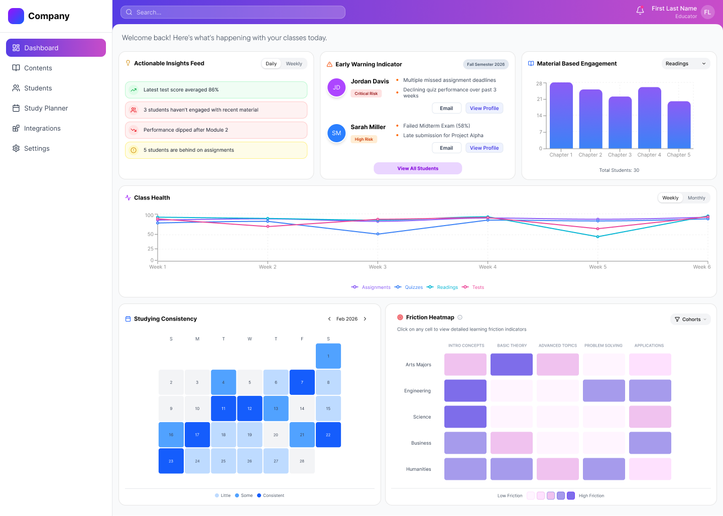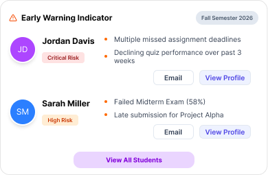 - Early Warning Indicators show students at risk with visible reasoning and clear follow-up actions