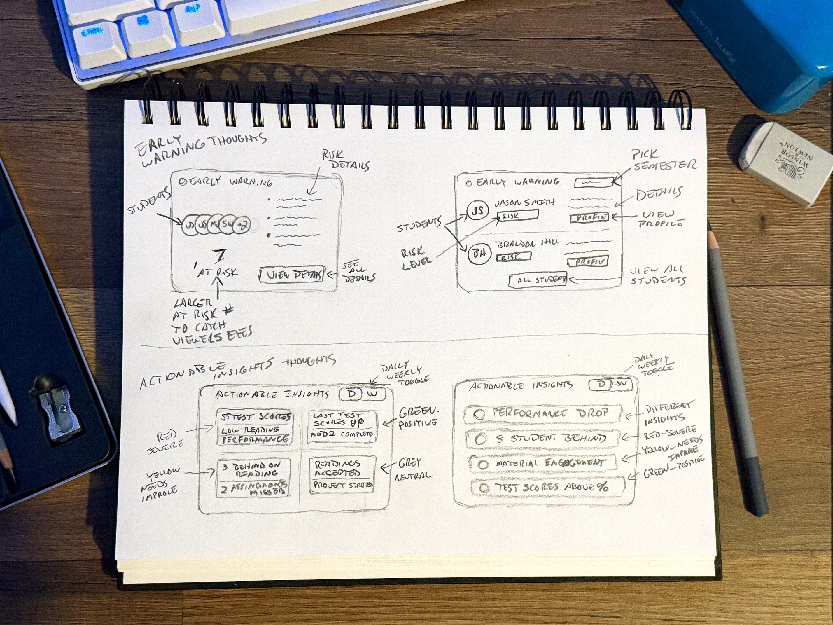 Before moving into Figma, I started by sketching out different dashboard cards and overall layout directions.This helped me translate research into something more tangible, exploring how key elements like at-risk indicators, trends, and cohort insights could take shape on the screen.