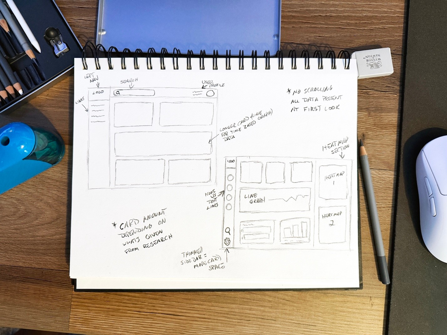 I also sketched full dashboard layouts to think through hierarchy and placement, making sure the most important information would surface quickly without overwhelming the view.