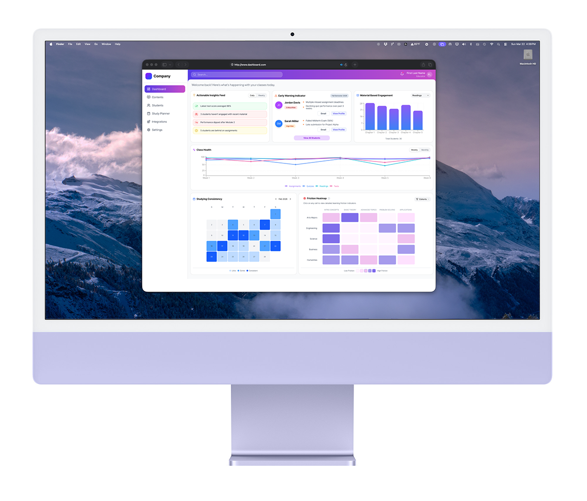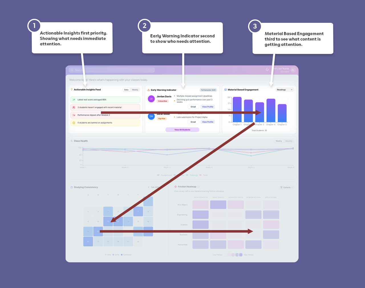 - Material-Based EngagementThese elements are positioned for immediate visibility, following a natural left-to-right, top-to-bottom scan.The experience shifts from:Grade reporting → Attention prioritizationInstead of asking, “What were the scores?” The dashboard shows, “Who needs me right now?”